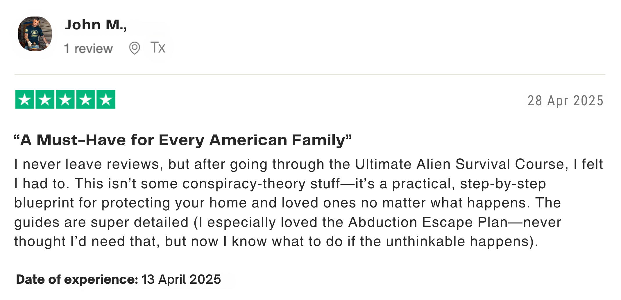 For those of us who know the alien invasion is inevitable, this course is a godsend. I’ve always felt like I had to figure out my survival plan on my own, but this course put everything into a clear, actionable guide. The "Abduction Escape Plans" module alone is worth the price. I’ve read about too many close encounters where people weren’t prepared to escape. This gives you a solid plan to avoid abduction, something I’ve personally worried about for years. My only feedback is that I wish there was even more focus on alien weaponry, but overall, it’s exactly what I needed. If you know what’s out there, don’t wait to get this course.